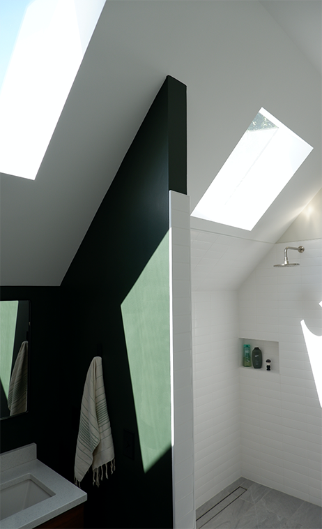 This project involved a second story addition to a 1940s home in SE Raleigh. The existing home included a finished attic space that was utilized as an office, guest space, and storage area. The client wanted to convert this unique,vaulted space into their master suite by adding a full master bathroom, closet, laundry area, and covered porch.